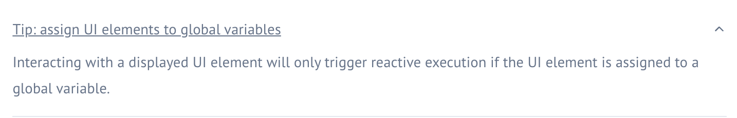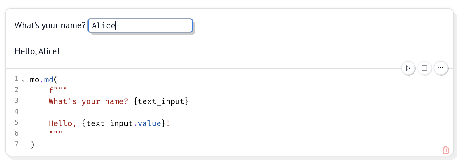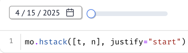 marimo has a large library of interactive UI elements, which you can use without callbacks โ just make sure to assign elements to global variables. See the API reference for a full list, and the interactivity guide for rules governing how UI elements work.