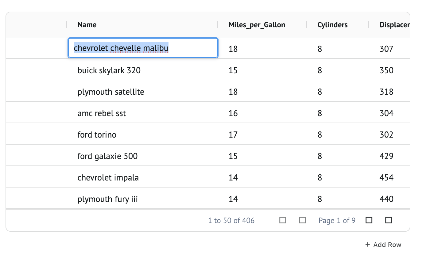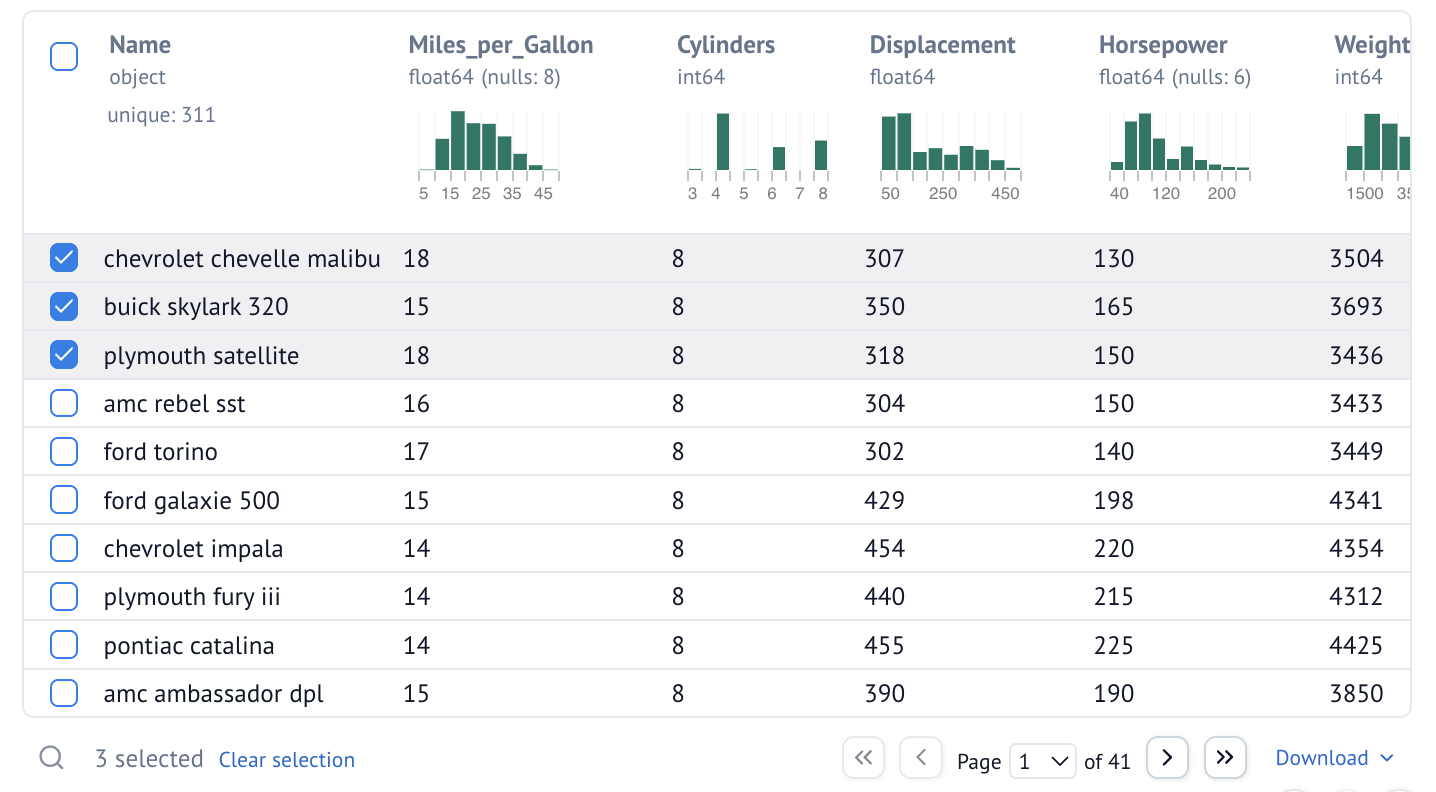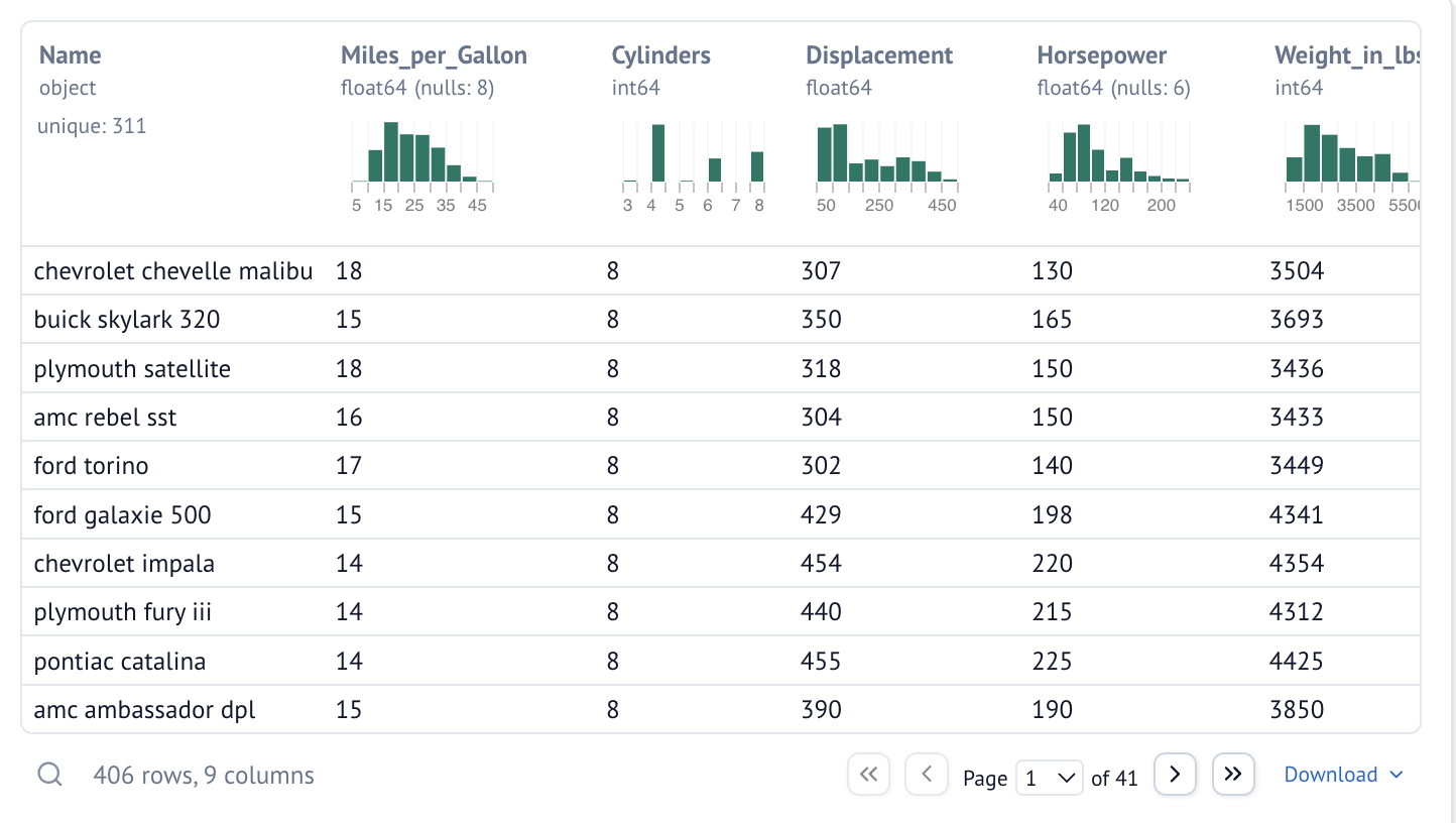 marimo is designed for working with dataframes. Here are a few examples; see the dataframes guide for details.
